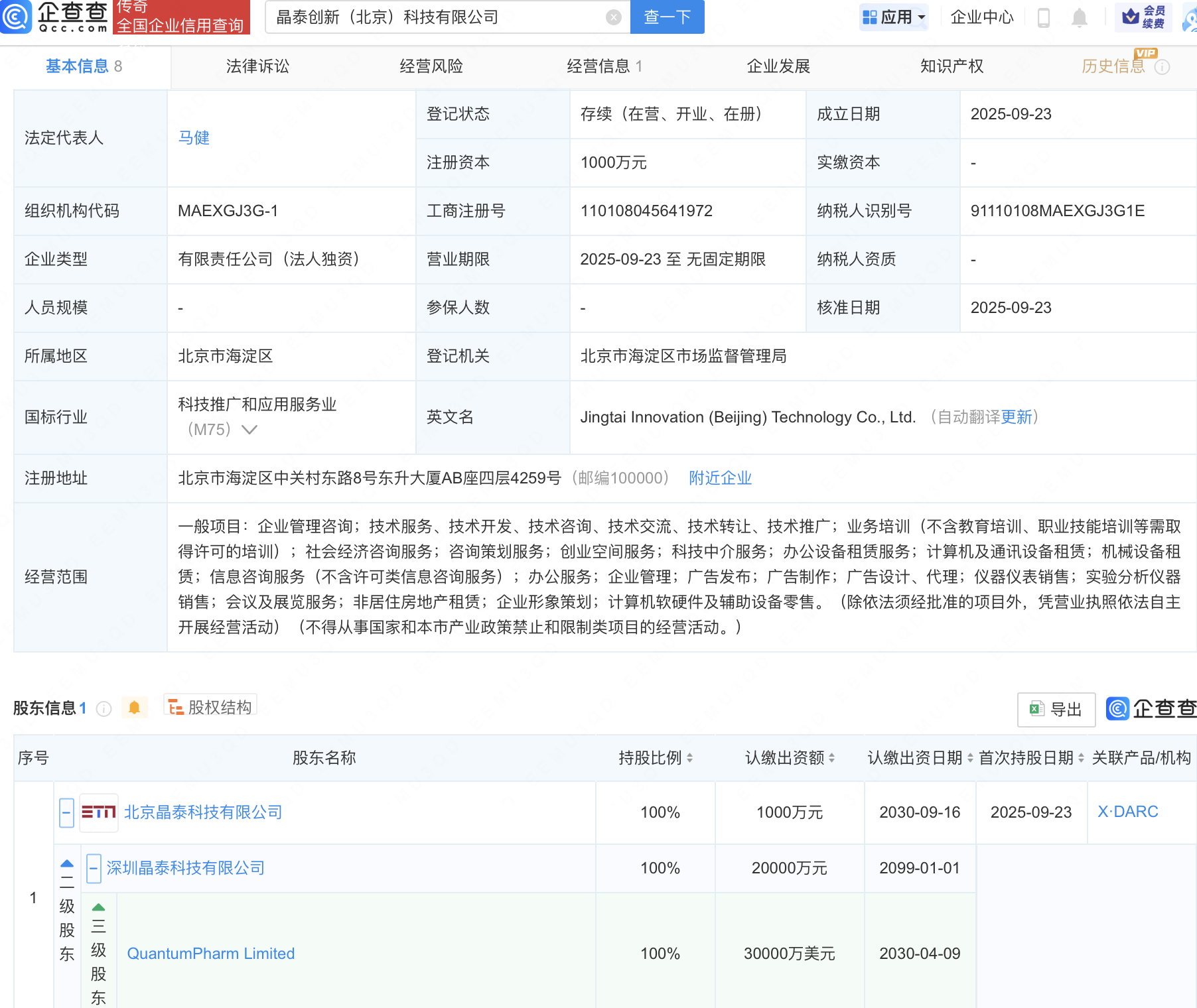 近日,晶泰创新(北京)科技有限公司成立,注册资本1000万元,经营范围包含:创业空间服务;科技中介服务;办公设备租赁服务;计算机及通讯设备租赁等。企查查股权穿透显示,该公司由晶泰控股关联公司北京晶泰科技有限公司全资持股。