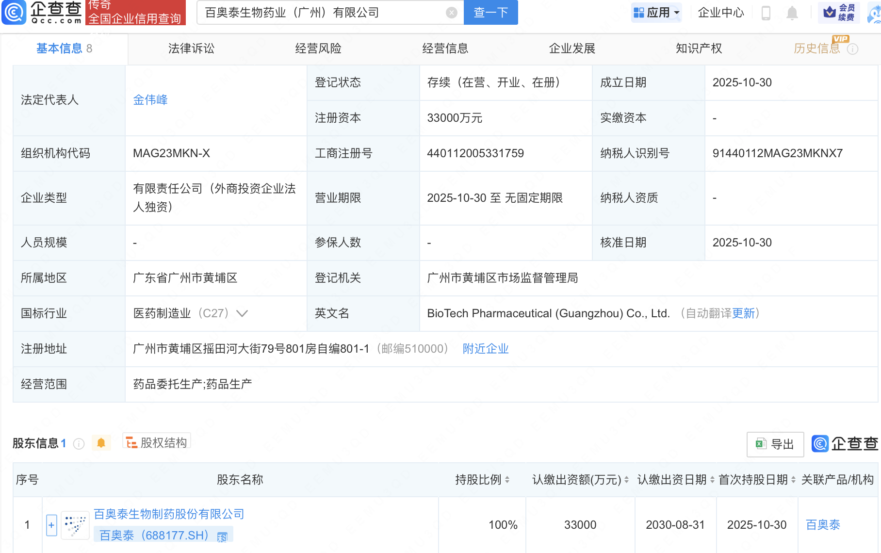 近日,百奥泰生物药业(广州)有限公司成立,注册资本3.3亿元,经营范围包含:药品委托生产;药品生产。企查查股权穿透显示,该公司由百奥泰(688177)全资持股。